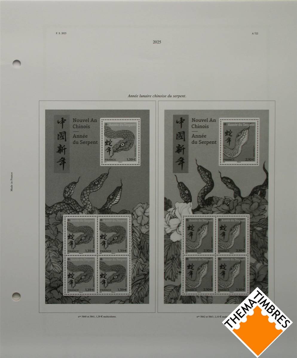 9 pages (A722 à A730 ) pour les timbres émis au 1er semestre 2025 (du numéro 5838 au numéro 5884.